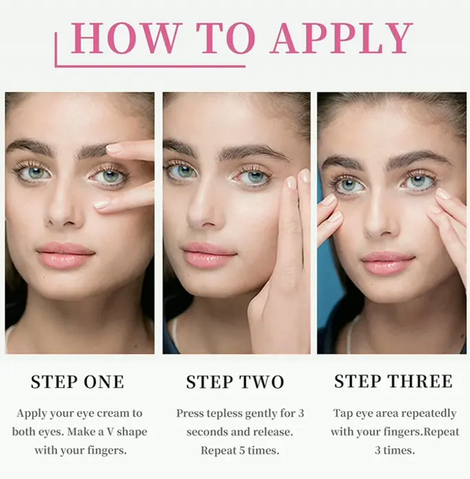 Deeply moisturizes, visibly smooths, tightens and illuminates the sensitive skin around the eyes, assisting restore the protective skin barrier. Our eye cream provides comprehensive anti-aging and moisturizing defense for the eyes all day long, targeting common indicators of aging eye area such as dark circles, puffiness, loss of firmness, skin looseness, fine lines, crow’s feet and dehydration. Use a small amount on the ring finger and gently pat around the eye and eyebrow bones, in the morning and evening. The fast-absorbing formula can be used alone or under makeup. The eye cream for women is suitable for all skin types, even reactive skin. Apply gently around the eyes and orbital bone twice a day to revitalize tired skin and help lift, regulate, enrich and revive vitality! Minimizes the appearance of dark circles and puffiness immediately. Bright white cream, not greasy, keeps eyes looking hydrated, smooth, bright and more awake.