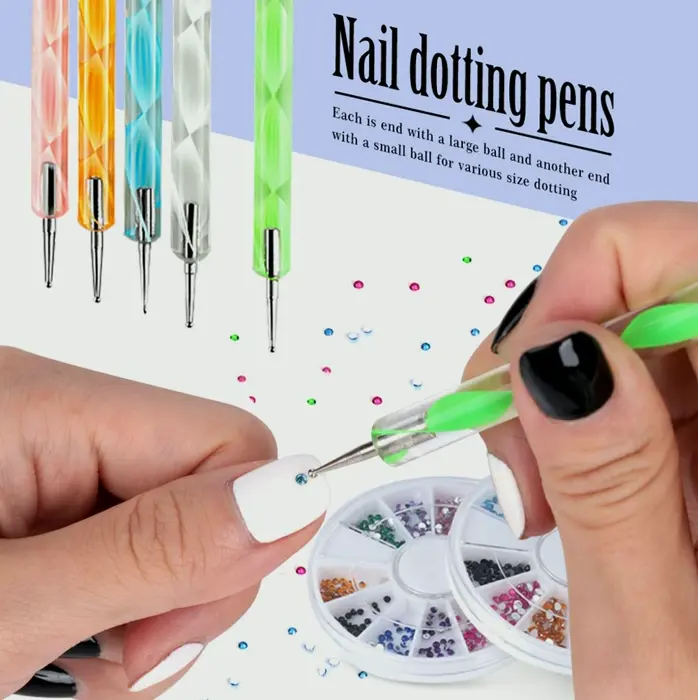 A great professional nail art set including 15 art tools, 5 painting pens, 2 gem cases, and 10 hues of colored tape. All essentials for beautiful nail art comes together.