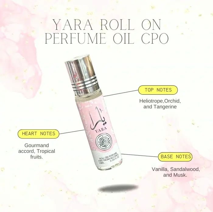 Yara by Ard Al Zaafaran is a delightful, gourmand perfume oil for all. This scent is an exquisite, elite Arabic perfume. Top Notes: Orchid, Citrus. Heart Scents: Gourmand accords. Final Scents: Sandalwood, Woody